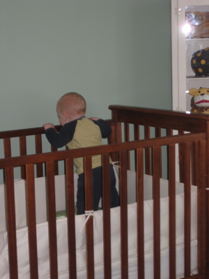 I snapped this picture during “Nap time”. Nash is able to pull himself up in his crib and enjoys chewing on the railing…
