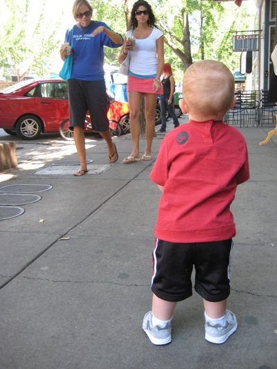 Nash LOVES LOVES LOVES dogs and has no fear of them! He shakes with excitement when he sees a dog and will do everything in his power to go pet it. (side note: I hate dogs. sigh.)