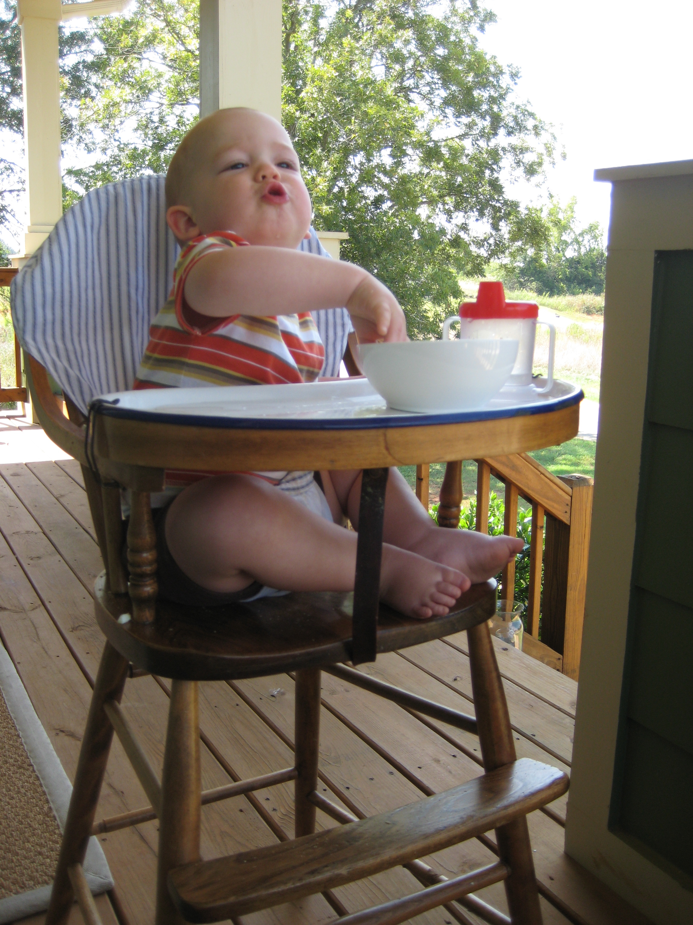 Our newest goal is learning that food should stay on the tray or in your mouth…but there are always more than a few crumbs that find their way to the floor despite his great efforts to be obedient. This week we ate lunch on the porch so I wouldn’t have to clean the floor…again. (plus it was GORGEOUS outside!)