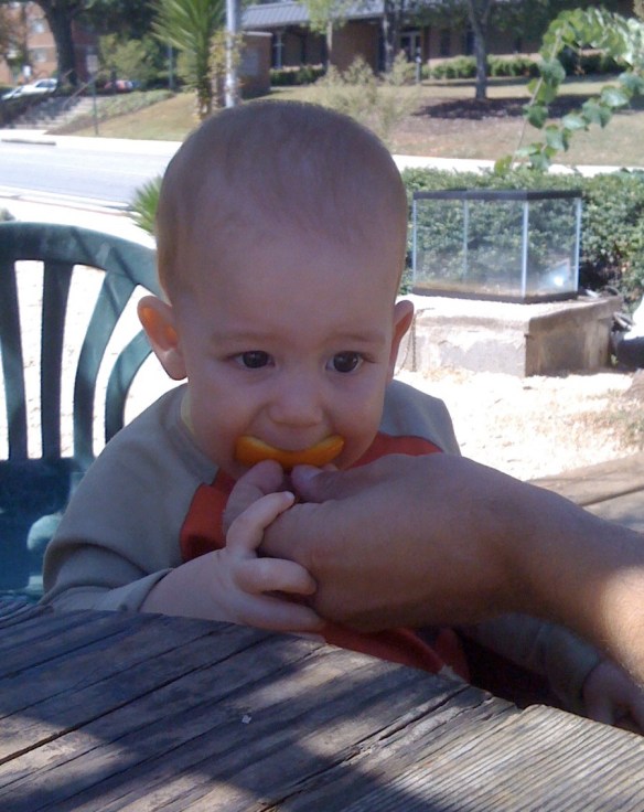 Nash aggressively enjoying an orange…yum.
