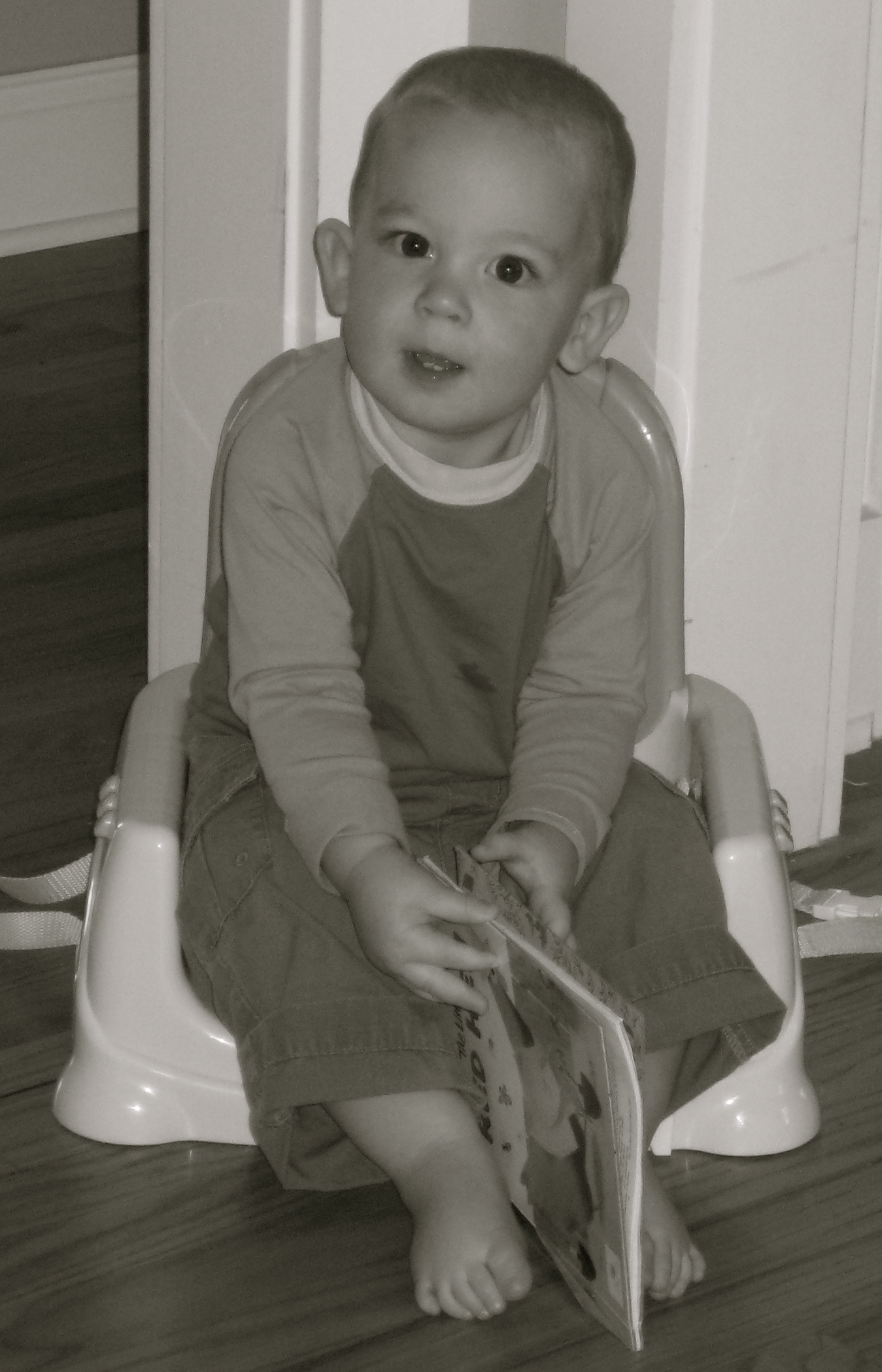 First thing in the morning Nash enjoys kickin’ back in his big guy chair (aka booster chair on the floor) and reading a book while I get breakfast ready…