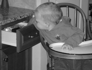 Being sneaky! Nash figured out that the junk drawers is within reaching distance of his highchair.