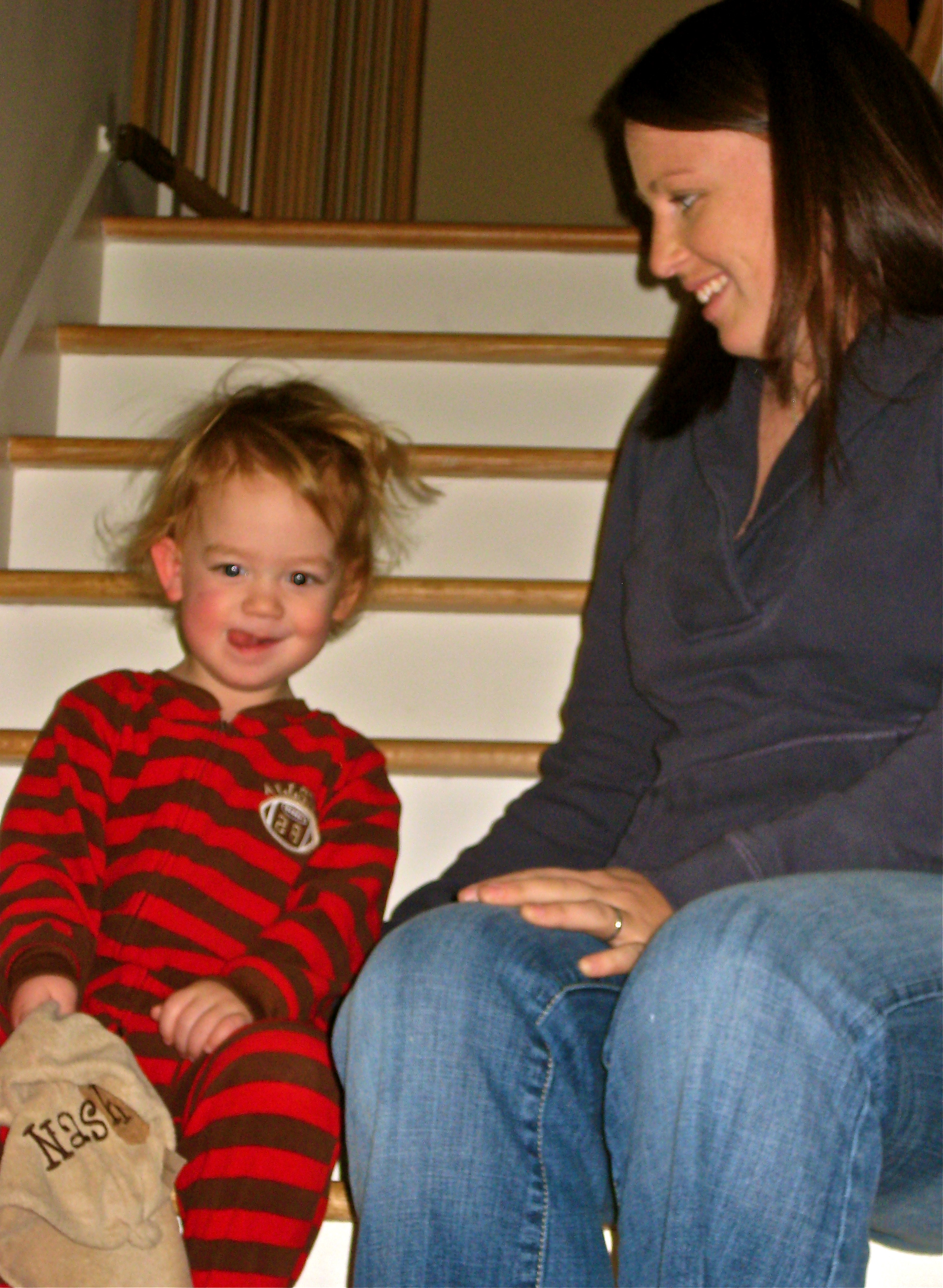 Waiting at the top of the stairs (a tradition) for Dad to turn on the tree and say it's time to come down. (Love the bed head!)