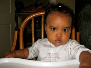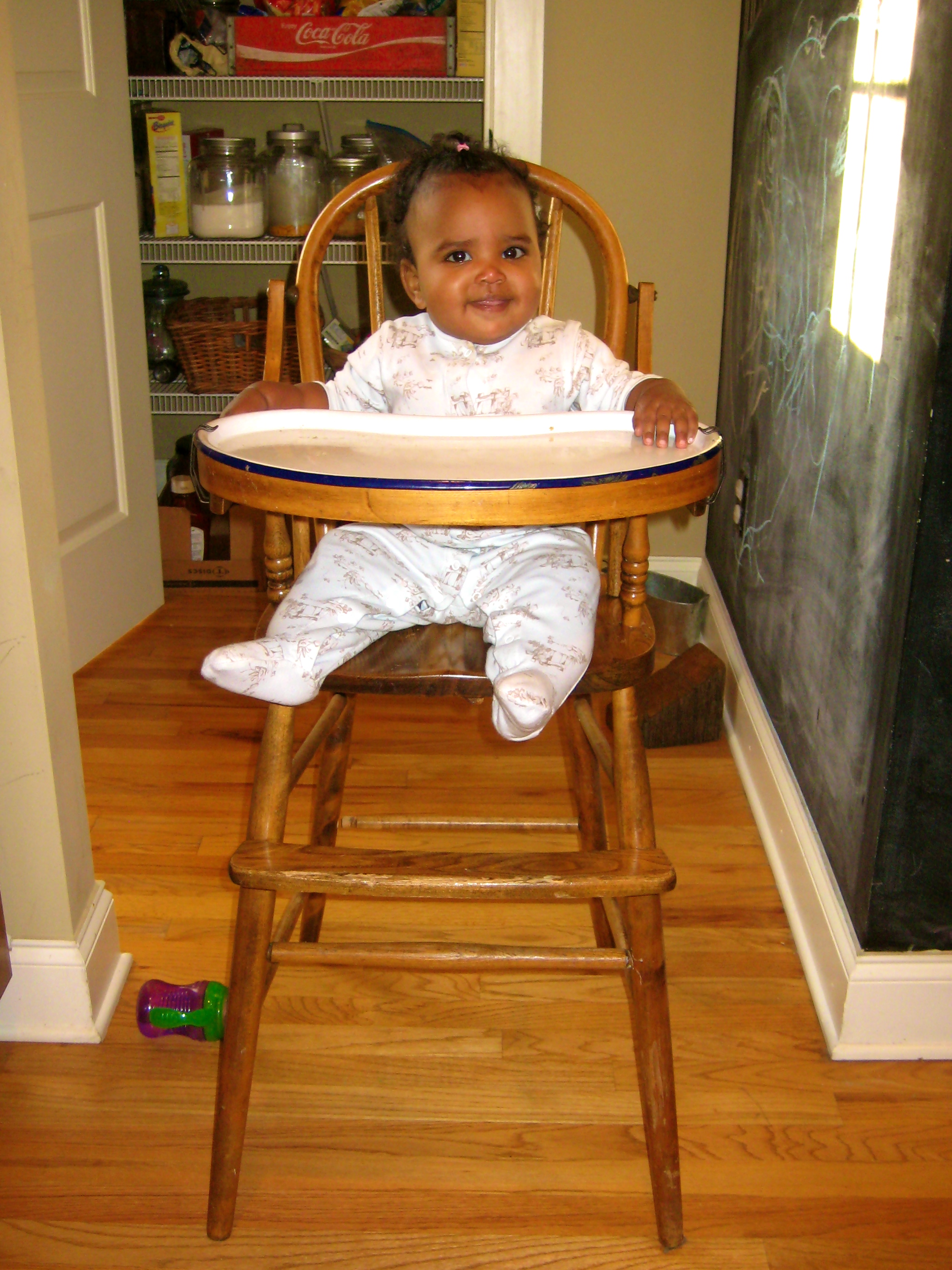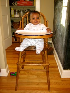 But check out the big girl in her big girl high chair (this chair, by the way, has been in the Vogeltanz family for more than 70 years! Every male in the family has used it for 3 generations! I just love it!)…