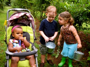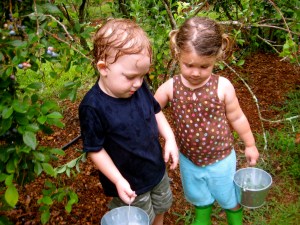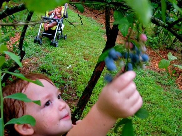 Today we went early morning blueberry picking and it was so fun. Nash ate far more blueberries than I actually put in my bucket. I’m pretty sure the owners of the farm should weigh the kids when they enter and then when they exit so I can pay for the pints of berries he consumed. (I am trying not to think about the awesome diapers we will have around here this afternoon! EIK!) Evyn was content as long as some one was putting a berry in her mouth…which Nash and his friend Addison thought was quite fun. It was a great morning. The kids were FILTHY and I had to strip them down and let them ride home in their diapers. Now…what in the world am I going to do with all these blueberries????