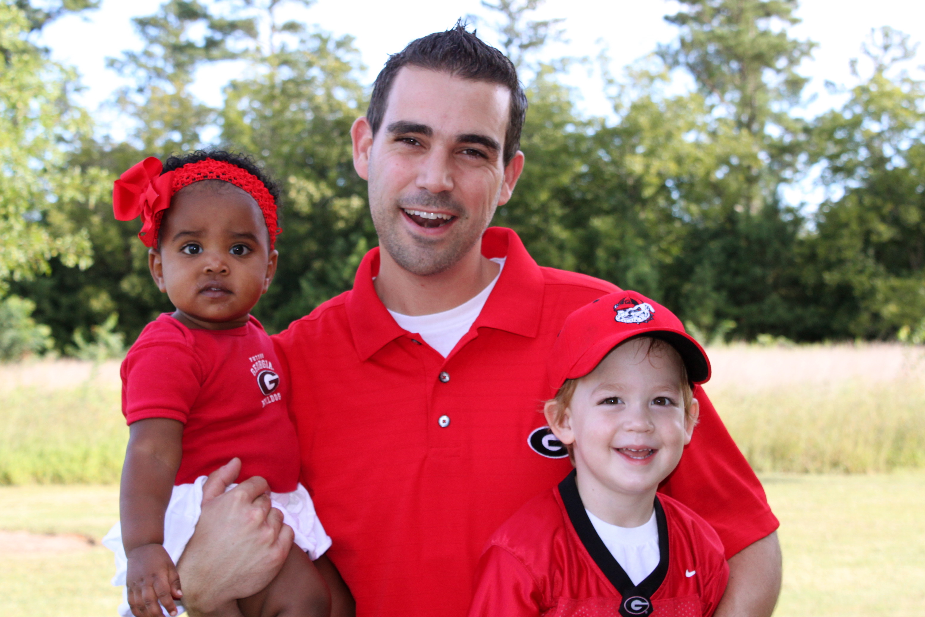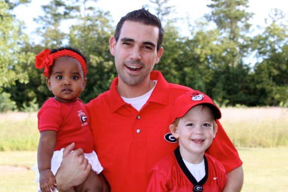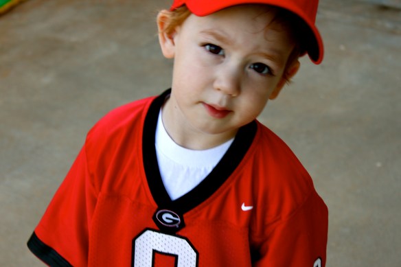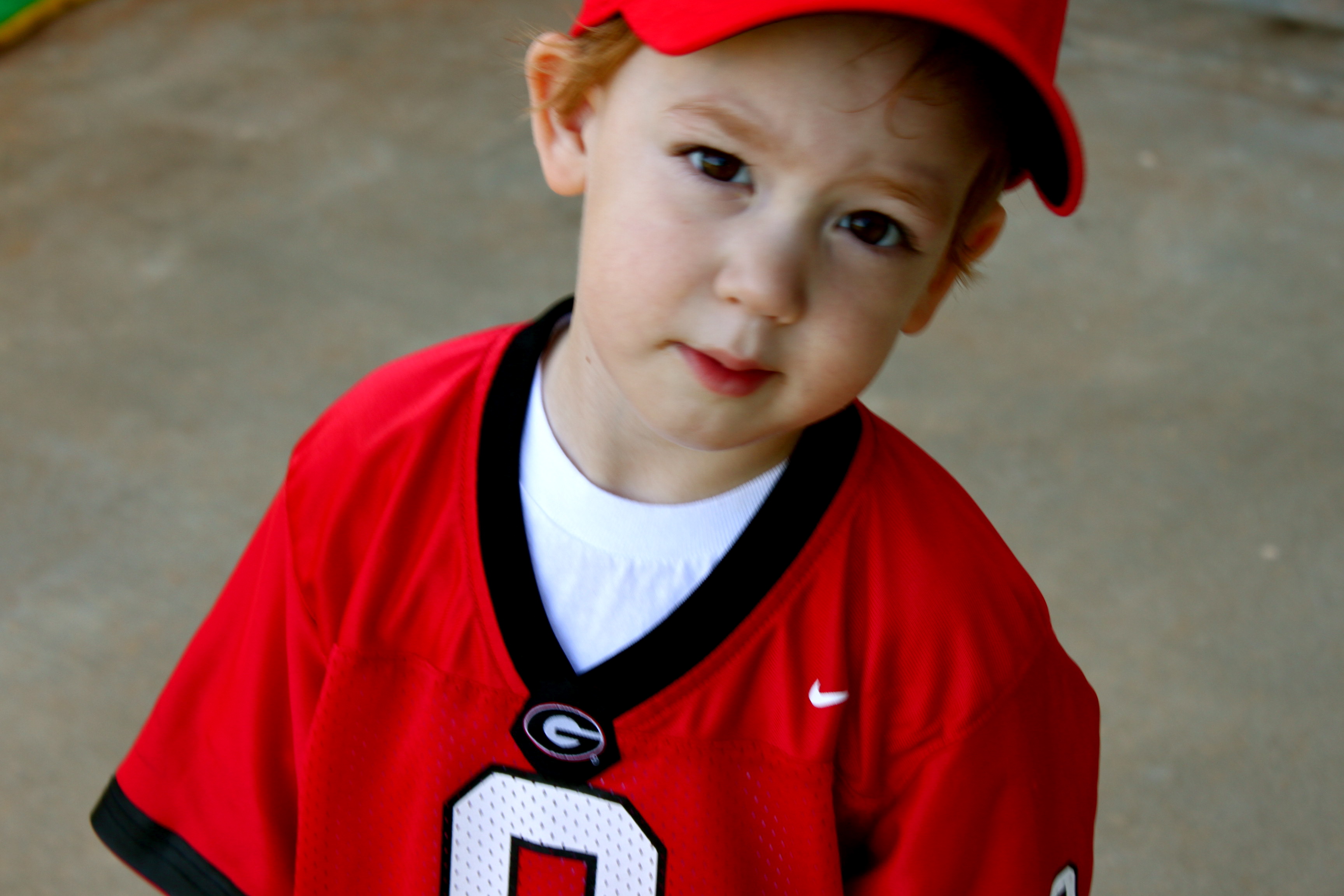Okay, lets be honest. I don’t know anything about football. I don’t particularly like football or any sport really. I don’t “bleed Red & Black”. I didn’t graduate from UGA or even understand the full obession of loving a college football team. However, I love Athens, Georgia. And part of living in this great town is learning to love the 6 days a year when our population doubles and Georgia mania ascends on our little country town. I’m not gonna lie, it’s pretty awesome. There is something nostaligic about a gorgeous fall day, bright blue skies and a perfect breeze coming through the open windows as you listen to Kirk Herbstreit (or as I refer to him, ” oh the cute announcer is talking”) talks about how the day of college football is going to shake down around the nation. It just feels so Americana…and that’s something I can get excited about.  I also think it is really fun (and kind of funny) to dress my kids up in their Georgia gear. It’s makes me feel like we are a part of something big…part of a community.