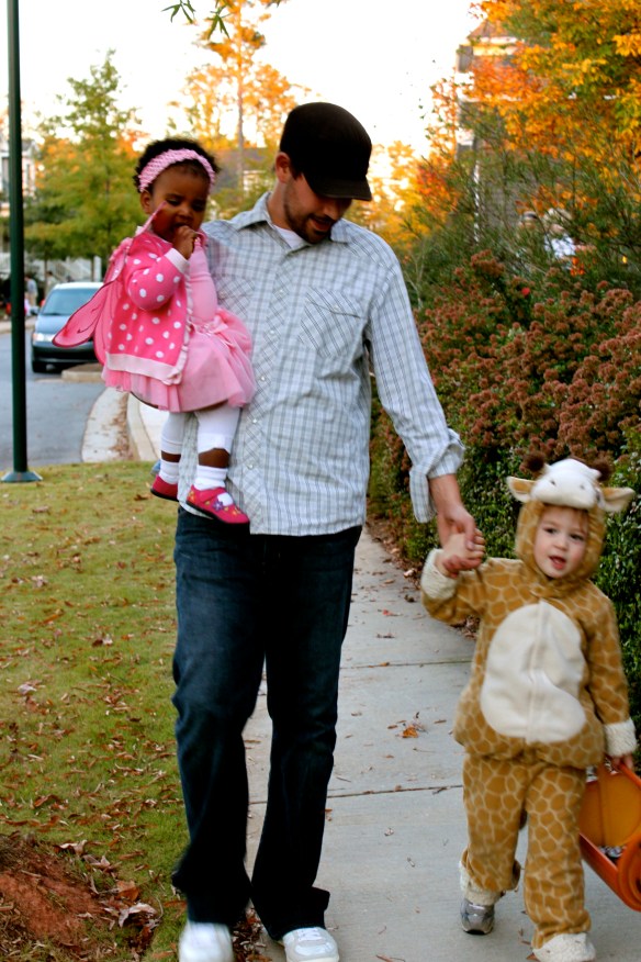 We had one very excited giraffe (who refused to be a fireman like mama had hoped, oh well.) and a very-grumpy-overly-pink-fairy for the 2010 Halloween festivities. We had a great night at Mimi + Pop Pop’s hanging out with friends, eating chili and of course, collecting candy. Much to my surprise, Nash LOVED trick-or-treating and did a great job walking up to the door and asking for candy. He had so much fun! He told me he wanted to be a giraffe because “everyone will laugh and think it is soooo funny”. I guess he enjoys giving people a good laugh!? Not sure why Evyn was not feeling the Halloween groove, but she looked cute as can be in her very pink fairy costume!