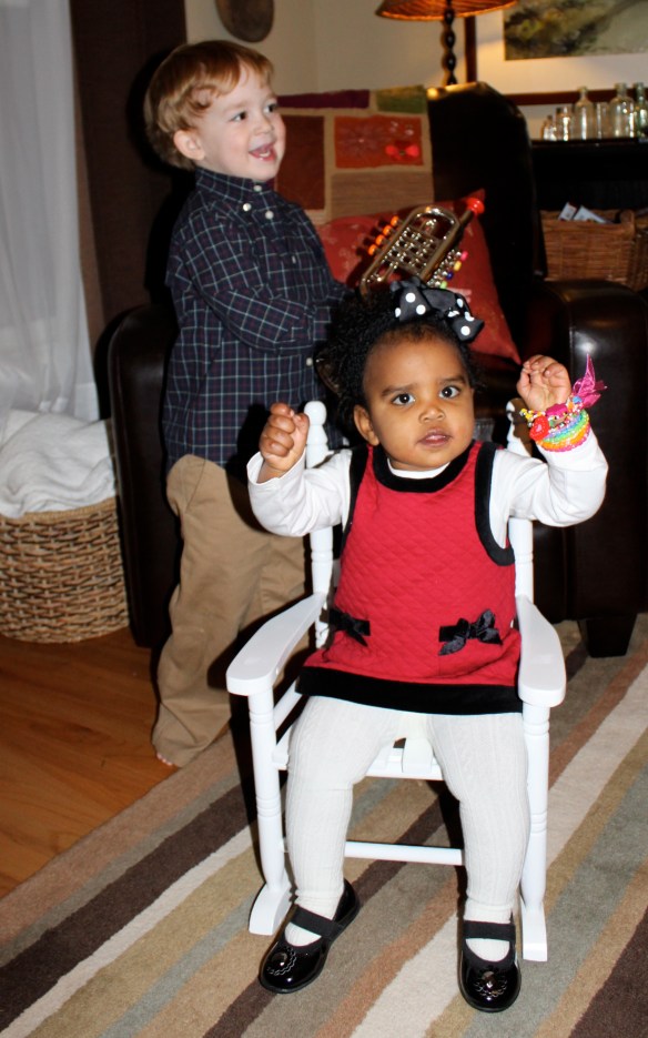 Yippeee for a toy trumpet and a sweet rocking chair!