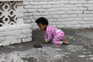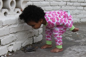 The previous owners of our home left us a very detailed manual about the house, yard, appliances, etc. While we are very grateful for the all the details they provided (and the level in which they cared for the home) we did laugh at some of the information in the binder. For example, there was a document about the neighbors living around us. It was just basic info about who they are, what house they live in, if they are nice, etc. One of the families mentioned in the document was “the Turtle Family” that lived behind our house. When I first read the info I literally thought they meant a family with the last name Turtle…but no, they were referring to a group of real turtles that apparently had made their home in the back yard. Now, I’m no animal lover, but I do have a soft spot for turtles. Call me crazy, but a turtle is probably the only animal I would stop my car for to help across a busy road. Well, the kids and I have looked and looked for “The Turtle Family” but to no avail…until yesterday. Sitting in our driveway was a surprise appearance by one of the members of the turtle family (or so I assume) making it’s way to it’s back yard paradise. Poor thing, he had not gotten the memo that the V-tanz family had moved to town or I promise he would have taken up residence in another neighbors yard! The moment Evyn laid eyes on that reptile, she was in LOVE! That turtle didn’t have a chance. With eardrum-busting-high-pitched squeals of delight, poking, kissing, in-your-face-interacation…She was in LOVE and had no fear! I promise you that that turtle was wishing he could run a little faster! You can see for yourself the turtle kept the kids busy all morning…