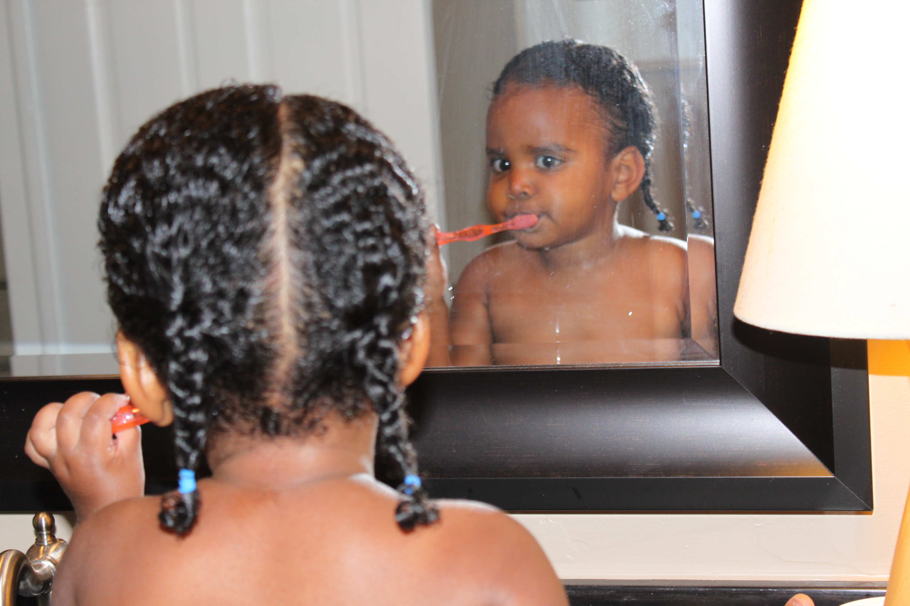 Two simple braids...and Evyn brushing her teeth. She has the cleanest teeth in the world thanks to her habit of brushing while I style her hair! 🙂