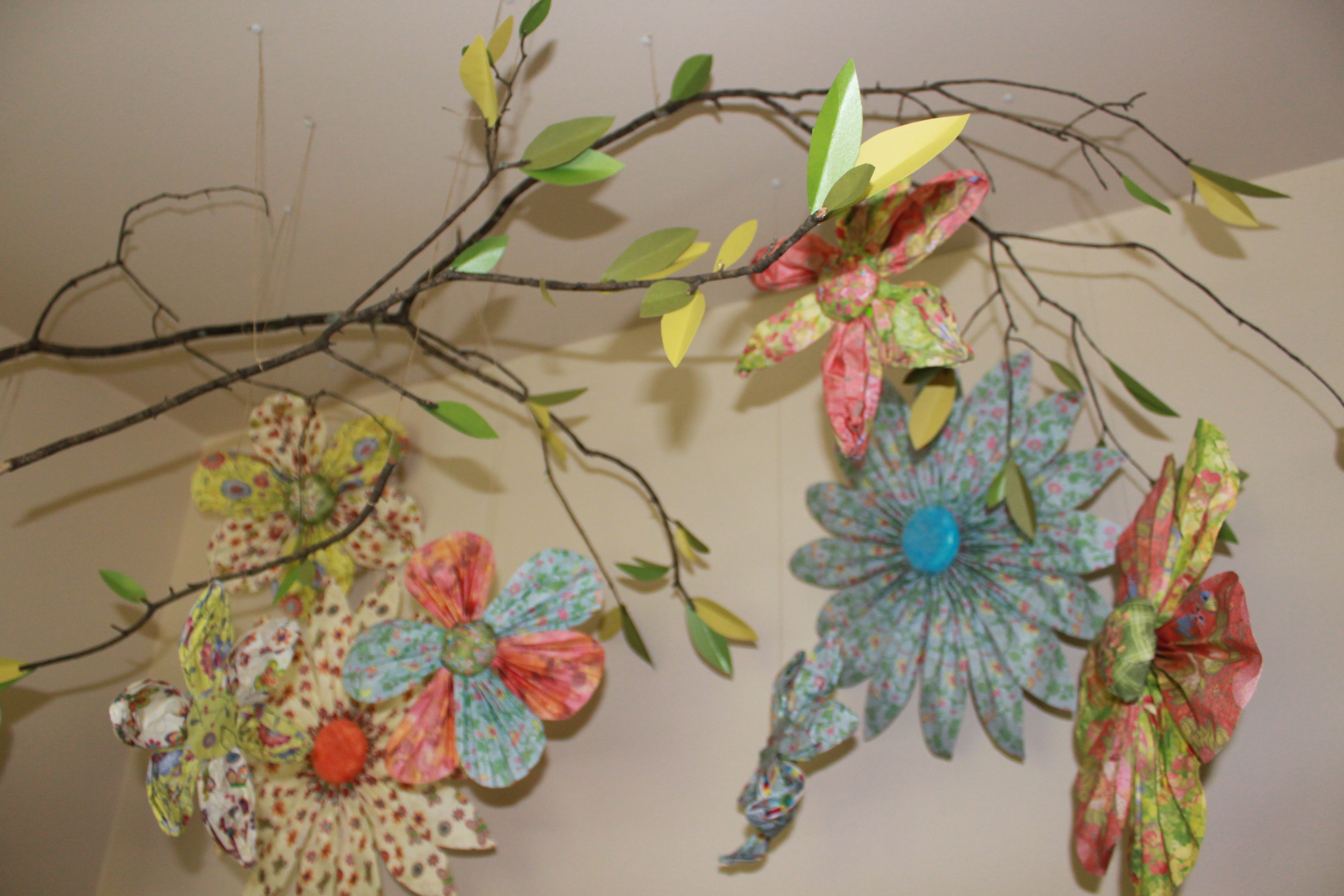 I created this mobile over her crib made with branches I found outside. I cut and glued assorted shades of green leaves onto the tips of the branches then hung paper flowers from Hobby Lobby from the limbs. It looks really adorable and I was so pleased with how it turned out.