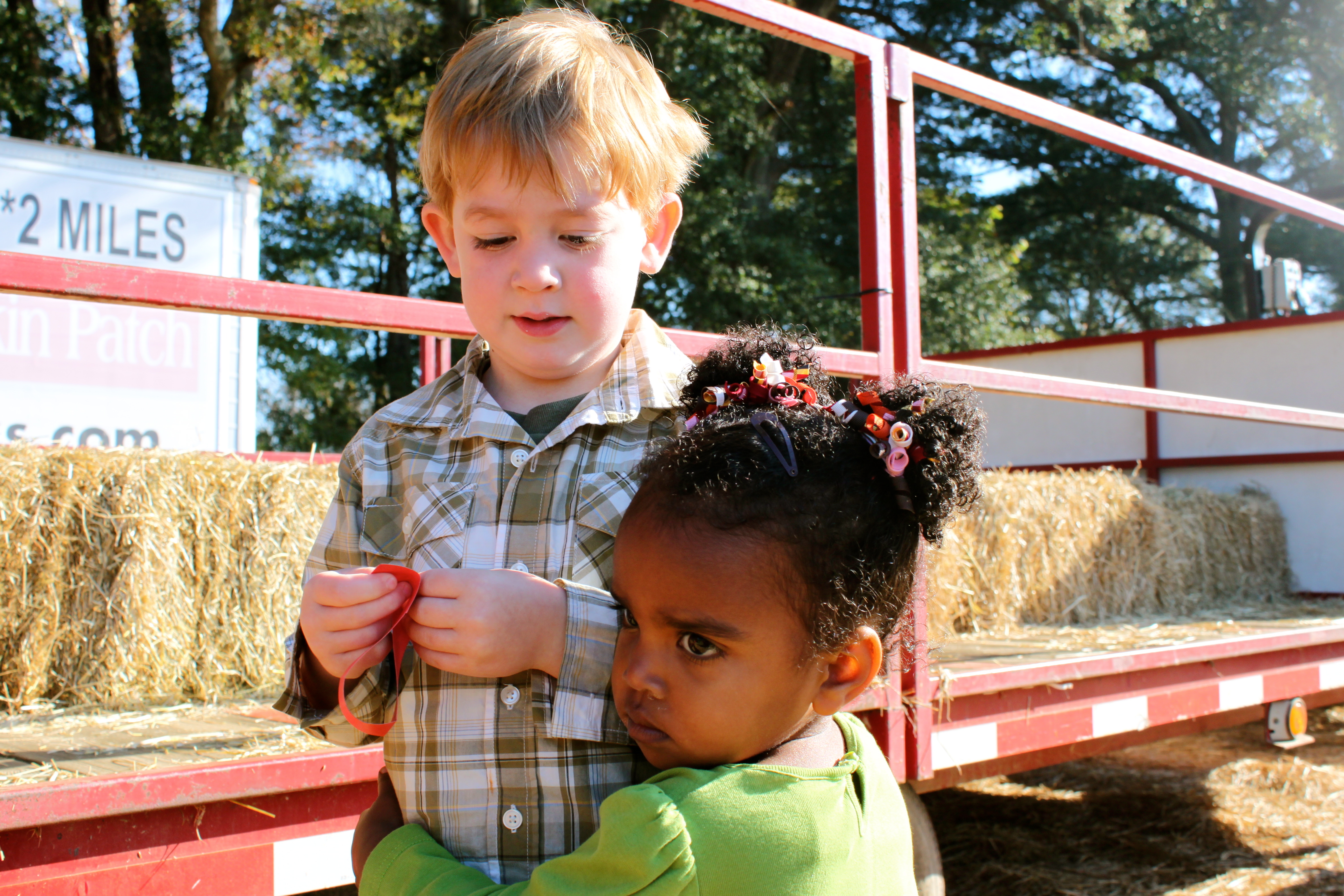 Evyn was a little scared of the hayride. Good thing for big brothers.
