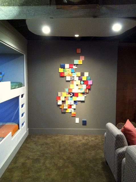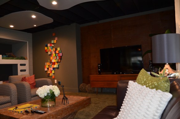 Our neighbor is an artist and was featured on Mega Dens with us. She did a custom piece for our basement and though it isn’t something I would have normally picked out for my home it is PERFECT in the basement and I really love it! Check out her blog post about the piece….