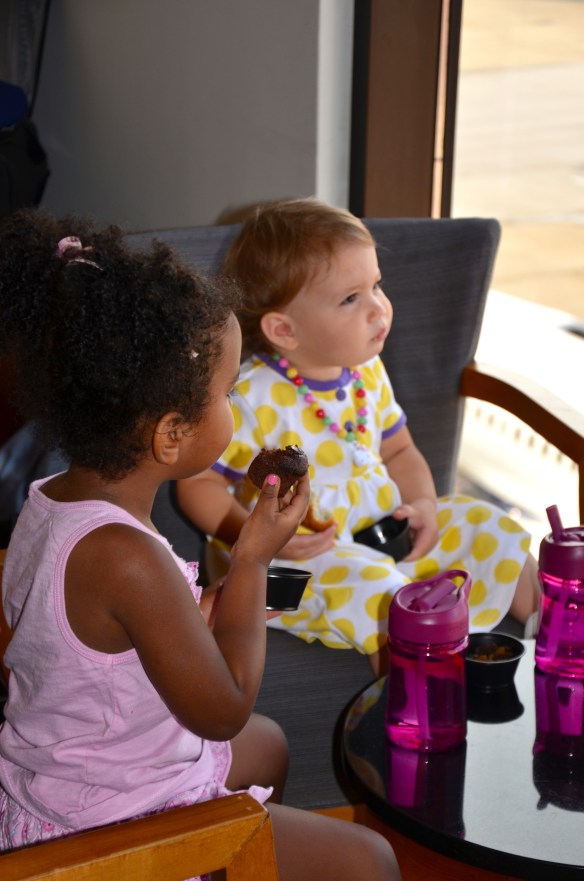 Atlanta to Portland. Bryson prepping the kids for the trip ahead. A perk to Bryson traveling so much is spending a few minutes raising havoc in the Sky Club. Thanks for the muffins and snacks. Sorry about the mess.