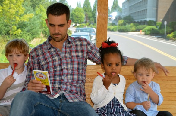 On the trolley ride…with old fashioned candy sticks. There is really nothing special to see in Oregon City…but the trolley was free and the kids thought it was fun…and we had a few hours to kill, so why not?! The candy sticks where good, though.