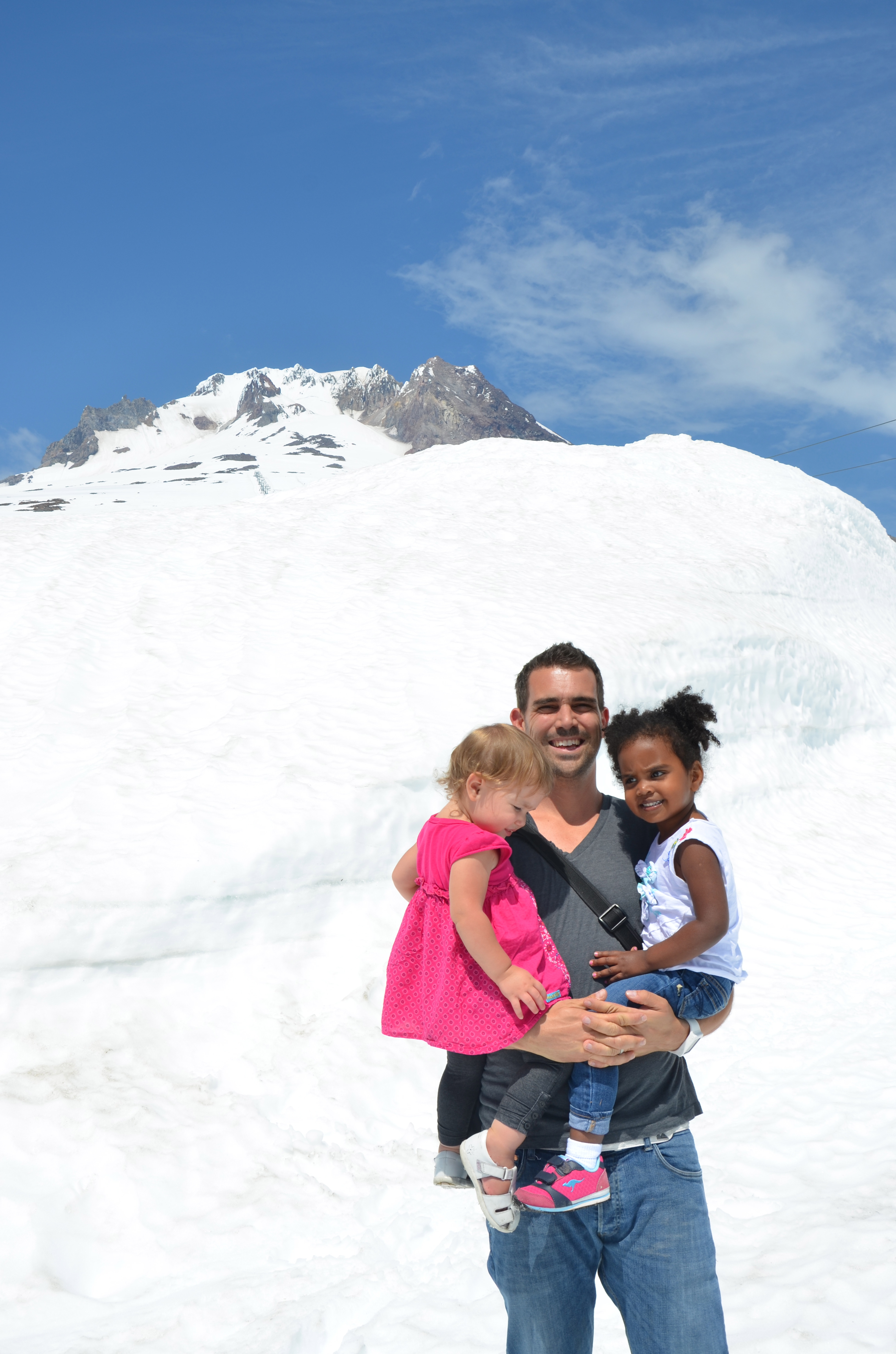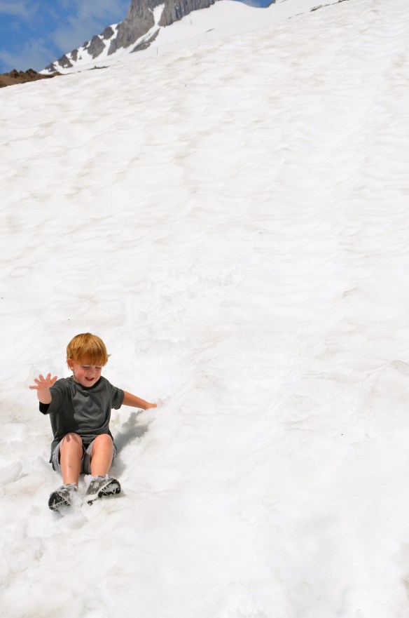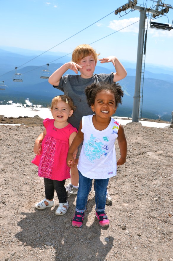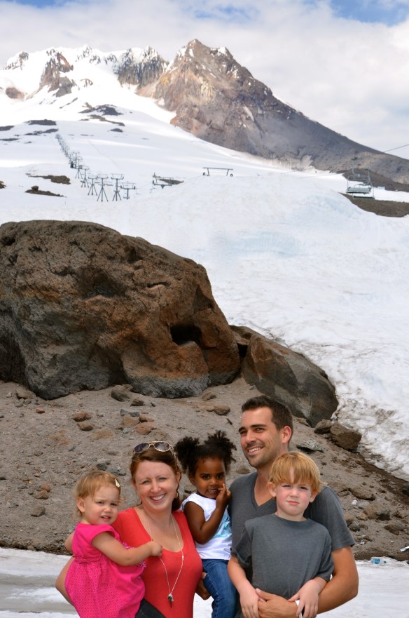 From the beach to the mountains! With Mt. Hood majestically standing guard over Portland, how could we not make the short drive up and let the kids touch the snow and watch the skiers and snowboarders…in JULY?! It’s not every day that you get to be at the beach in the morning and with skiers in the afternoon. The funny part was it was freezing cold at the beach and actually hot on top of the mountain. Nash had been asking all week to climb the big mountain, so we did…