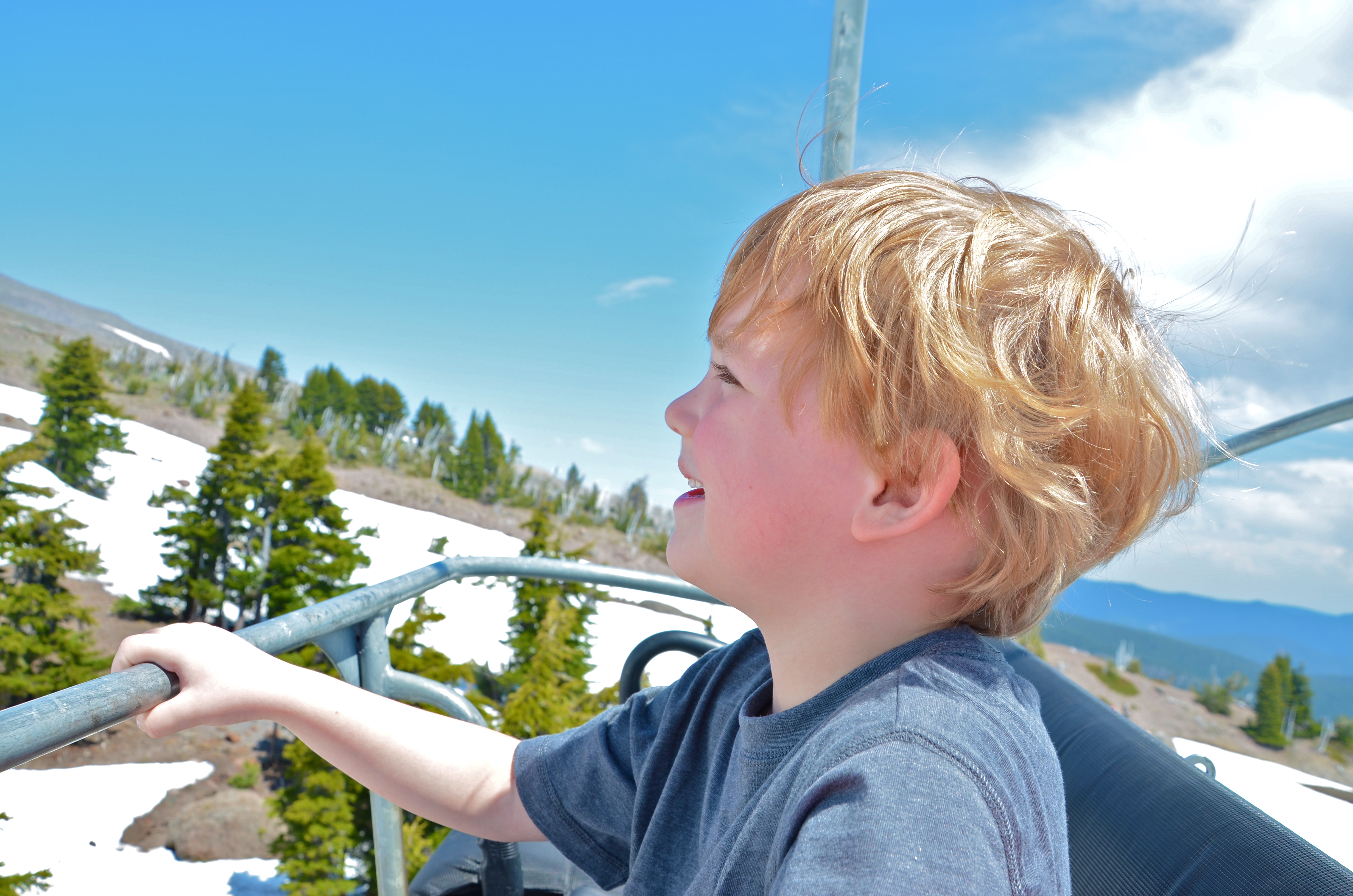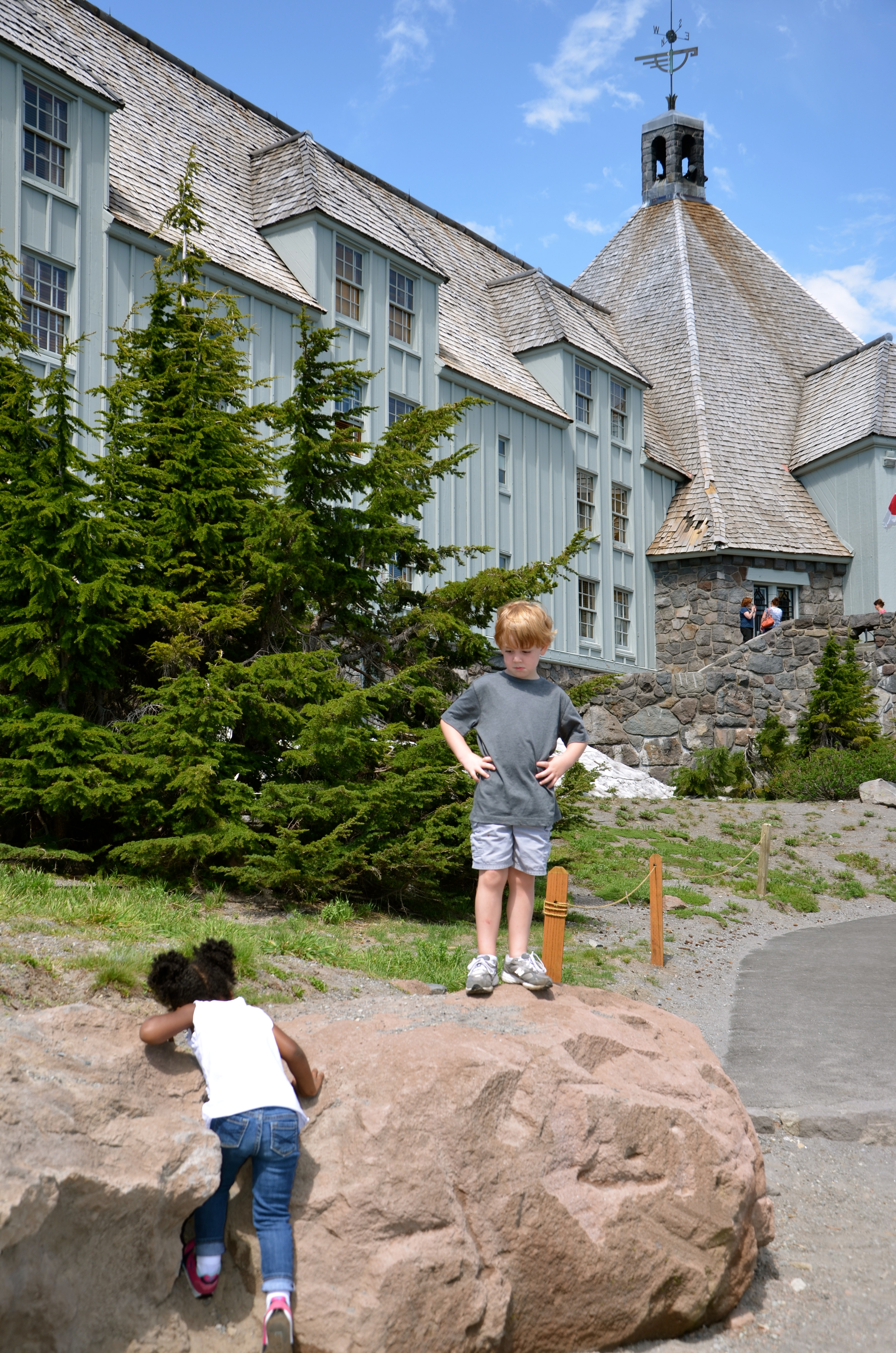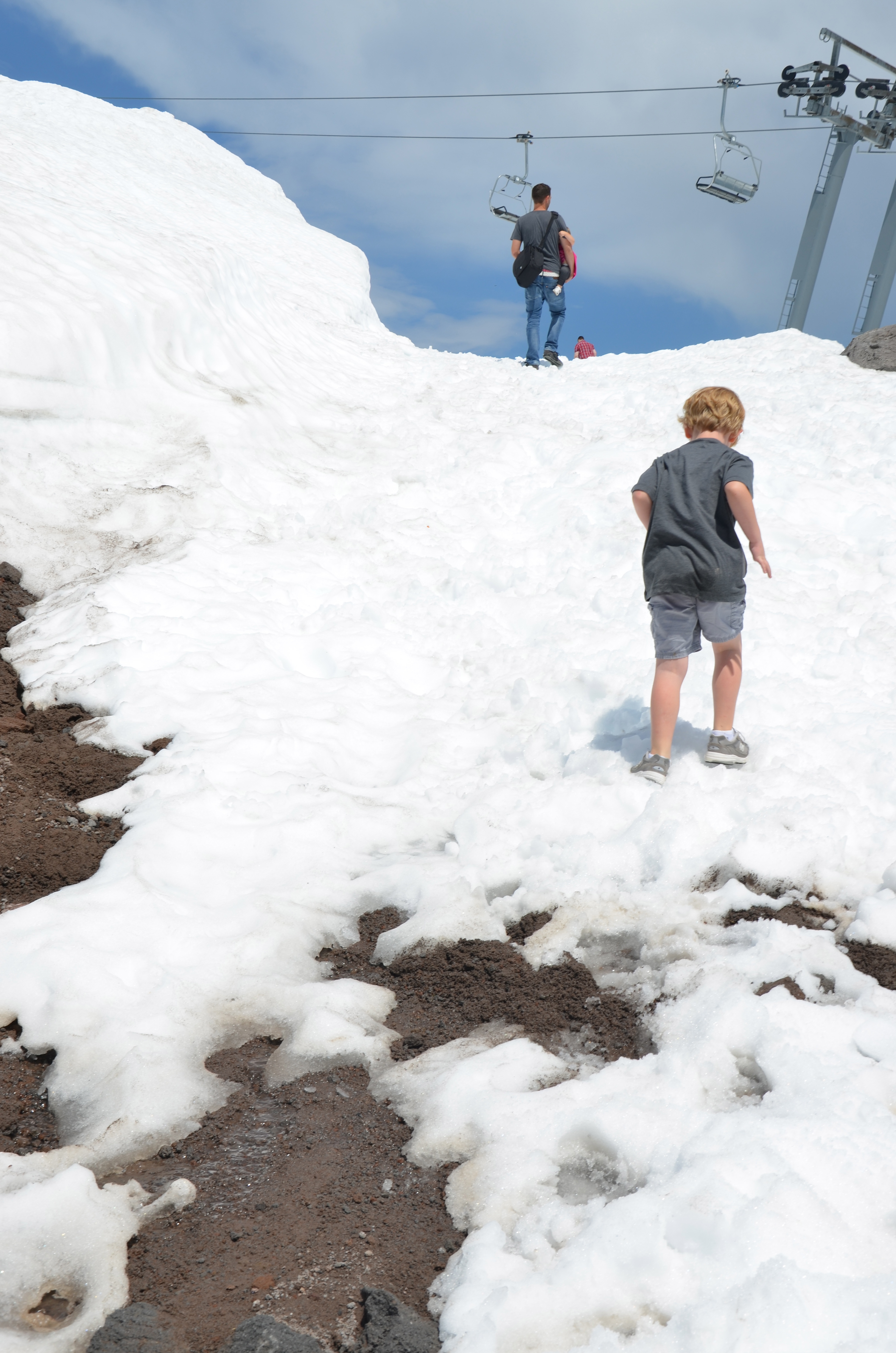 From the beach to the mountains! With Mt. Hood majestically standing guard over Portland, how could we not make the short drive up and let the kids touch the snow and watch the skiers and snowboarders…in JULY?! It’s not every day that you get to be at the beach in the morning and with skiers in the afternoon. The funny part was it was freezing cold at the beach and actually hot on top of the mountain. Nash had been asking all week to climb the big mountain, so we did…