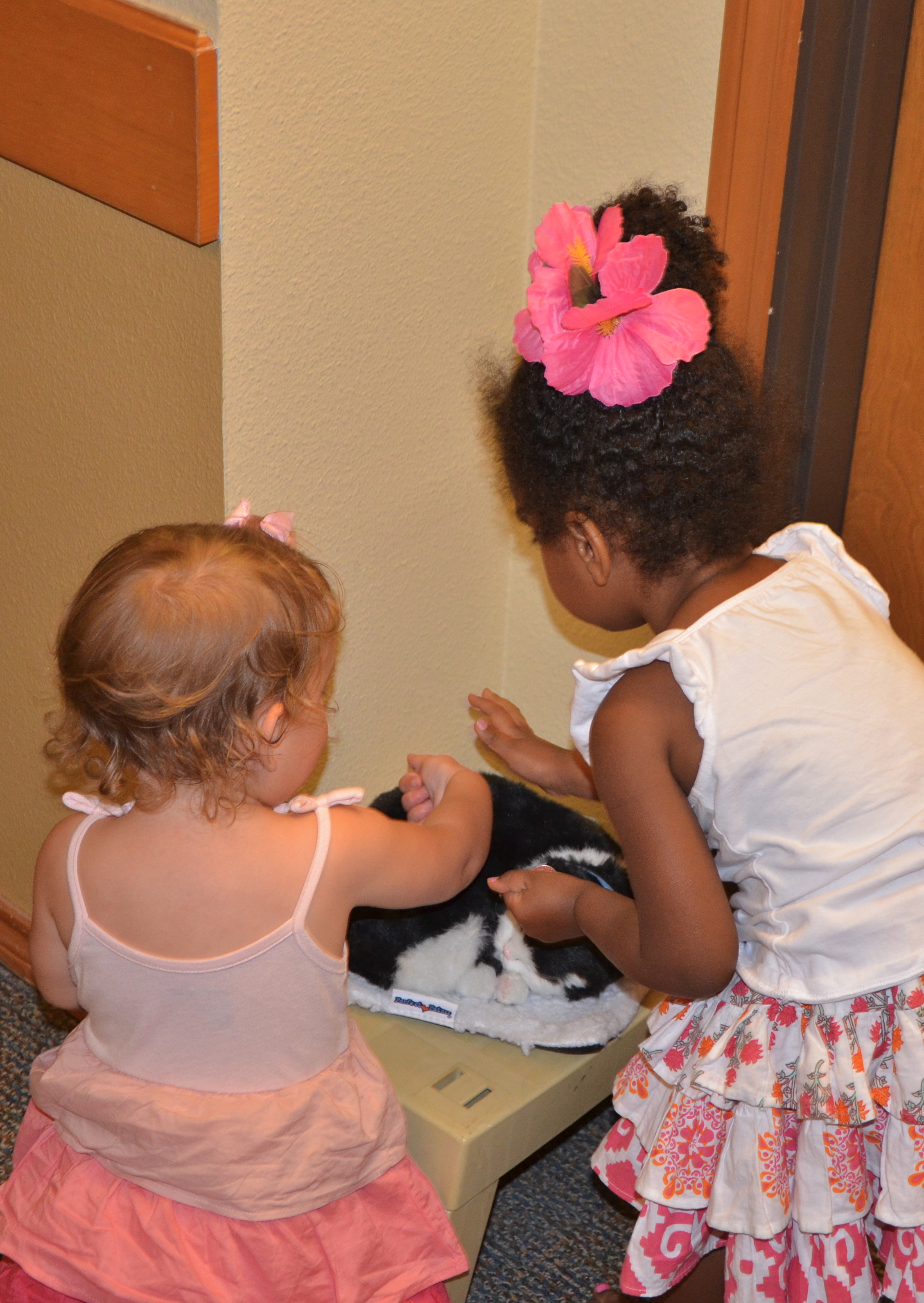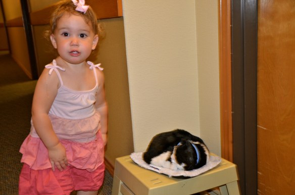 What my kids loved best about “our apartment”(as Nash called it) was how there were little tables outside each door in the hallway decorated with little trinkets….like fake flowers, 4th of July holiday plates, framed cross stitch sayings, photos of relatives, little glass angels, etc. My kids were facinated with the little treasures on display.There were also endless bowls of candy just within reach of their little hands. My kids LOVED this and thought it was Halloween! One particular door along the hall had a battery operated kitty cat that looked like it was curled up sleeping. Meyer and Evyn, though concerned that the kitty was ALWAYS asleep, LOVED stopping to pet, speak to, and kiss the cat every single time we passed by. Needless to say, it took us several minutes to make our way to our room each time. We had a great stay and hopefully we brought a few smiles to some of Betty’s friends living in the community.