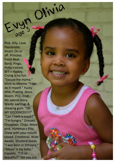 I forgot to post this a few weeks ago on Evyn’s Birthday. On my kids birthday’s I like to write down a few phrases or words that will help remind me down the road what was important to them during that time. Here is Evyn’s recap for her 3rd birthday. It was a great year and it makes me smile to see words that will help me remember the past year spent as the mama to this spunky little girl….oh, I mean, big girl.